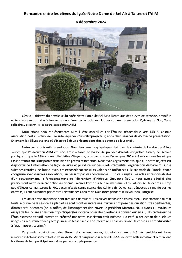 Présentation de l’association AIIM au Lycée Notre Dame de Bel Air à Tarare le 6 décembre 2024 Rencontre AIIM et BELAIRTélécharger 00
